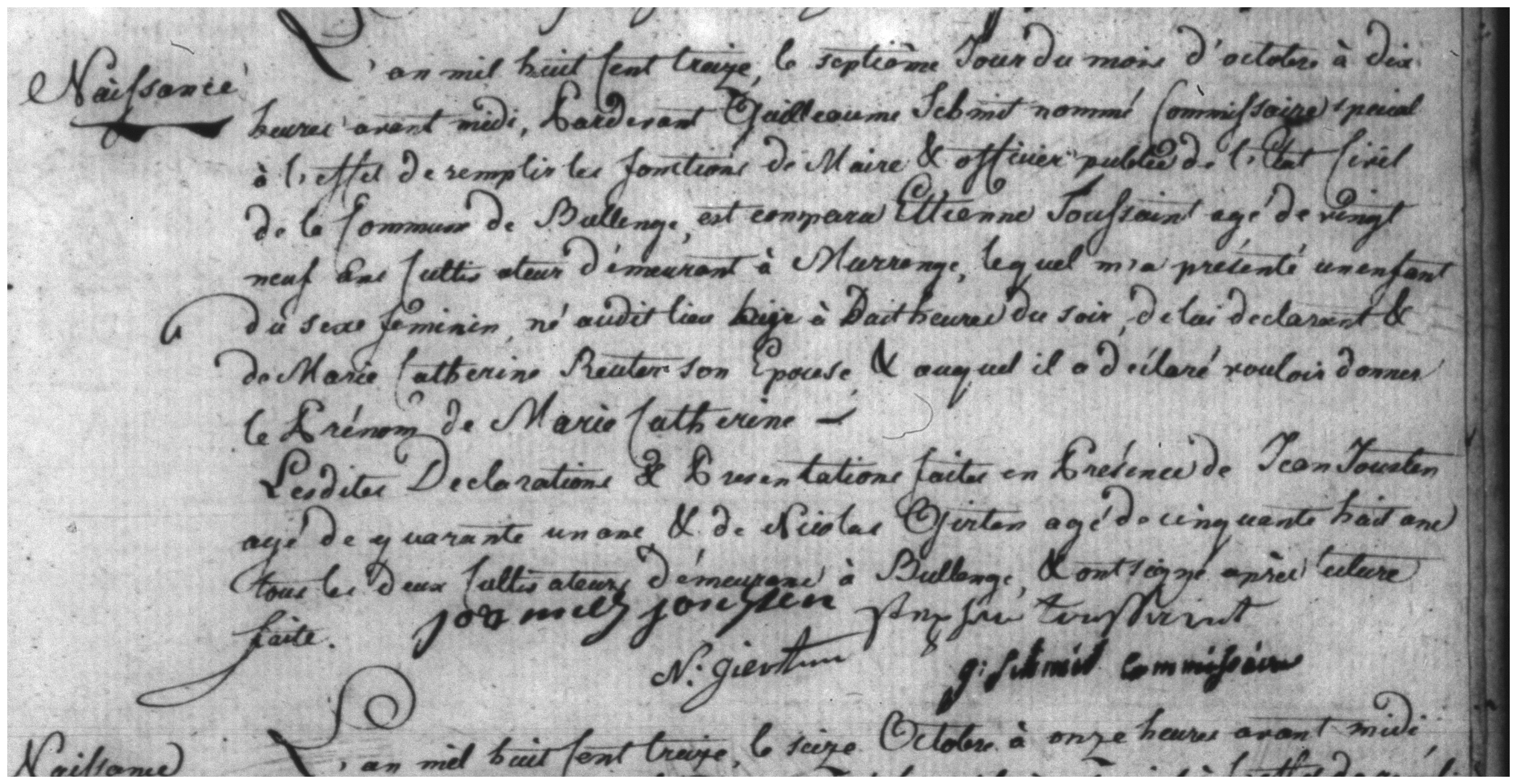 L'an mil huit Cent treize, le septième Jour du mois d' october à dix heures avant midi, pardevant Guillaume Schmit nommé Commissaire special à tretter de remplir les fonctions de Maire & officier public de l'Etat Civil de le Commune de Bullenge, est comparu Ettienne Toussaint, agé de vingt neuf ans Cultivateur démeurant à Murrenge, lequel m'a présenté un enfant du sexe feminin, né au dit lieu hiyr à Dait heures du soir, de lui declarant & de Marie Catherine Reuter son Epouse & auquel il a déclaré vouloir donner le Prénom de Marie Catherine.