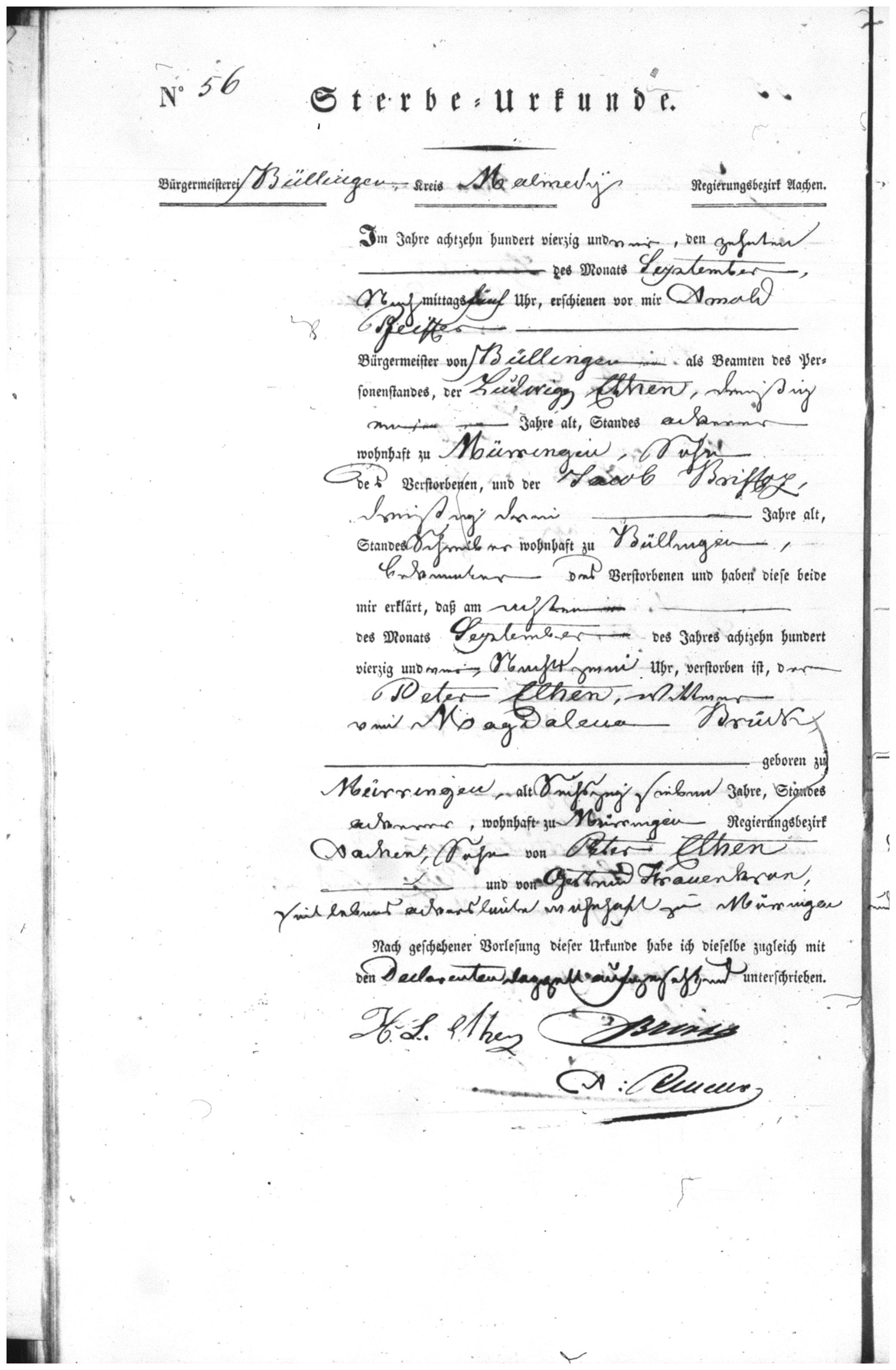 Im Jahre tausend achthundert vierzig und vier, den zehnten des Monats September, Nachmittags fünf Uhr, erschienen vor mir Arnold Pfeiffer, Bürgermeister von Büllingen als Beamten des Personenstandes, der Ludwig Ethen, dreißig neun Jahre alt, Standes ackerer wohnhaft zu Mürringen, Sohn des Verstorbenen, und der Jacob Bristog, dreißig drei Jahre alt, Standes Schreiber wohnhaft zu Büllingen, bekannnter des Verstorbenen und haben diese beide mir erklärt, daß am achten des Monats September des Jahres tausend achthundert vierzig und vier, Nachts zwei Uhr, verstorben ist, der Peter Ethen, Witwer der Magdalena Brück, geboren zu Mürringen, alt Sechszig Sieben Jahre, Standes ackerer, wohnhaft zu Mürringen Regierunsbezirk Aachen, Sohn von Peter Ethen und von Gertrud Frauenkron, seit lebens ackersleute wohnhaft zu Mürringen.